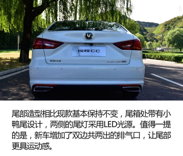 车尾部分,新车的尾部造型依旧比较饱满,其尾灯组还是采用了不规则造型,尾灯的内部结构较为精致,并加入了LED光源,夜晚点亮时十分醒目。长安锐程CC尾部与现款车型最大的区别,是其采用了双边共两出的排气口,让尾部看起来更加具有运动感。