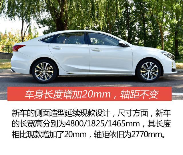 从侧面来看,新车的车身腰线微微上扬,营造出一种向前俯冲的姿态,搭配多辐式轮圈,彰显运动时尚气息。车身尺寸方面,新车的长宽高分别为4800/1825/1465mm,轴距为2770mm,其长度相比现款增加了20mm(其余就没啥变化了)。值得一提的是,新车的车长增加了以后,使得外观看起来更加舒展大气,其轴距虽没有加长,但作为家用车,乘坐空间相当宽裕了。